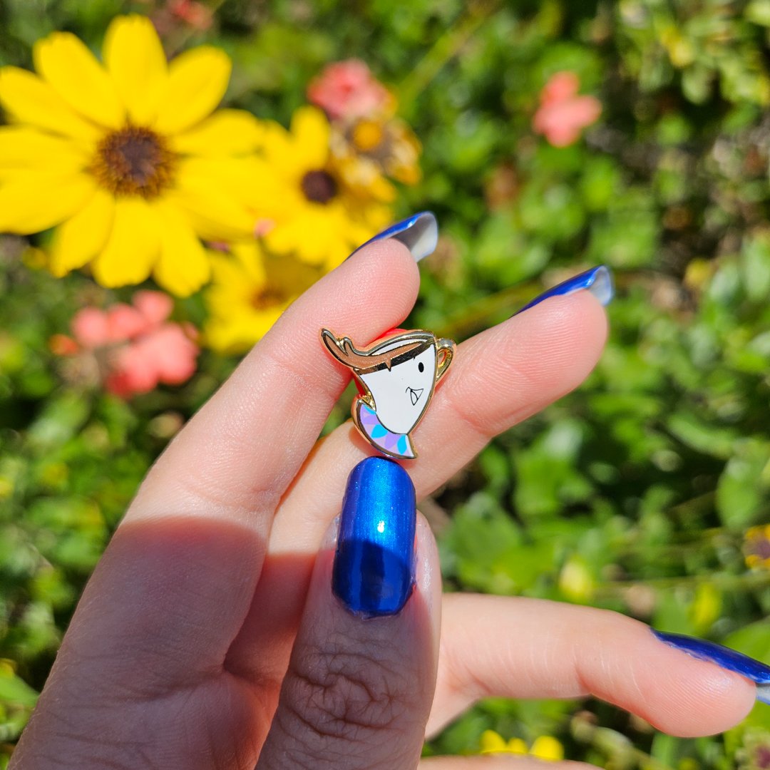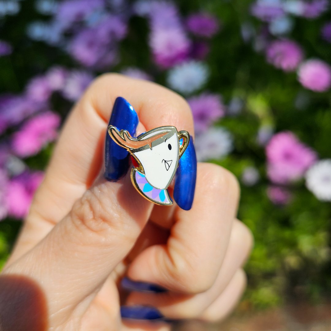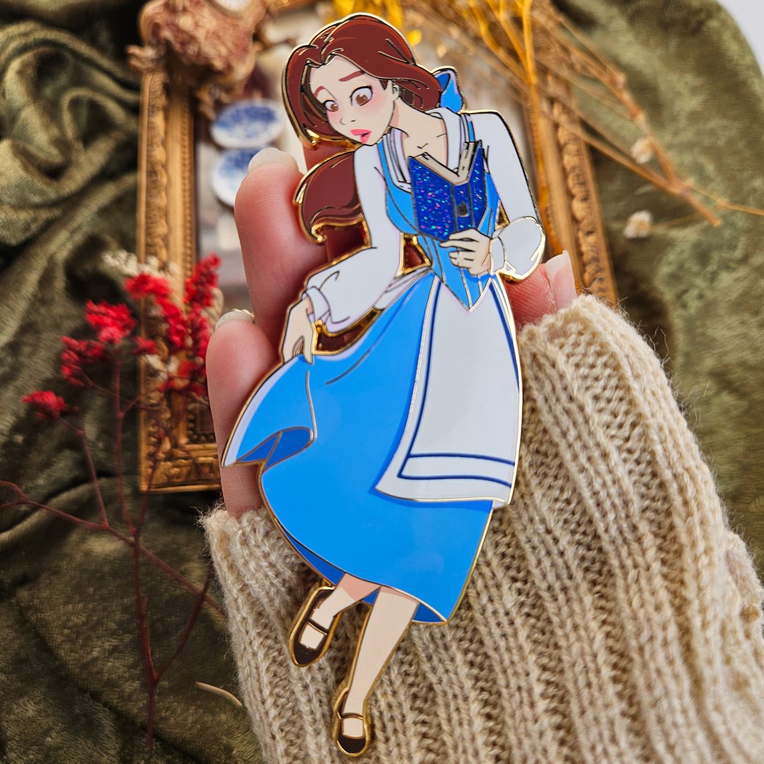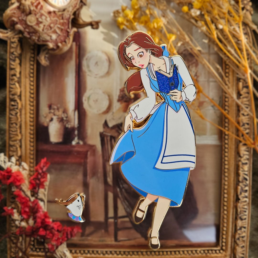 Be our guest and experience the magic of the little things with our wonderful two-pin set! We couldn't be more thrilled for this charming design. Our stunning duo includes Belle, standing tall at 4.5 inches (11.4cm) with detailed screen printing and glitter effects, and the adorable Chip, standing at a cute .65 inches (1.6 cm) with screen printing and beautiful pearl swirl effects. These pins are designs to adorn a standard 5x7 frame. Limited to just 35 units, each set comes with red backing pins and a customized backing card.