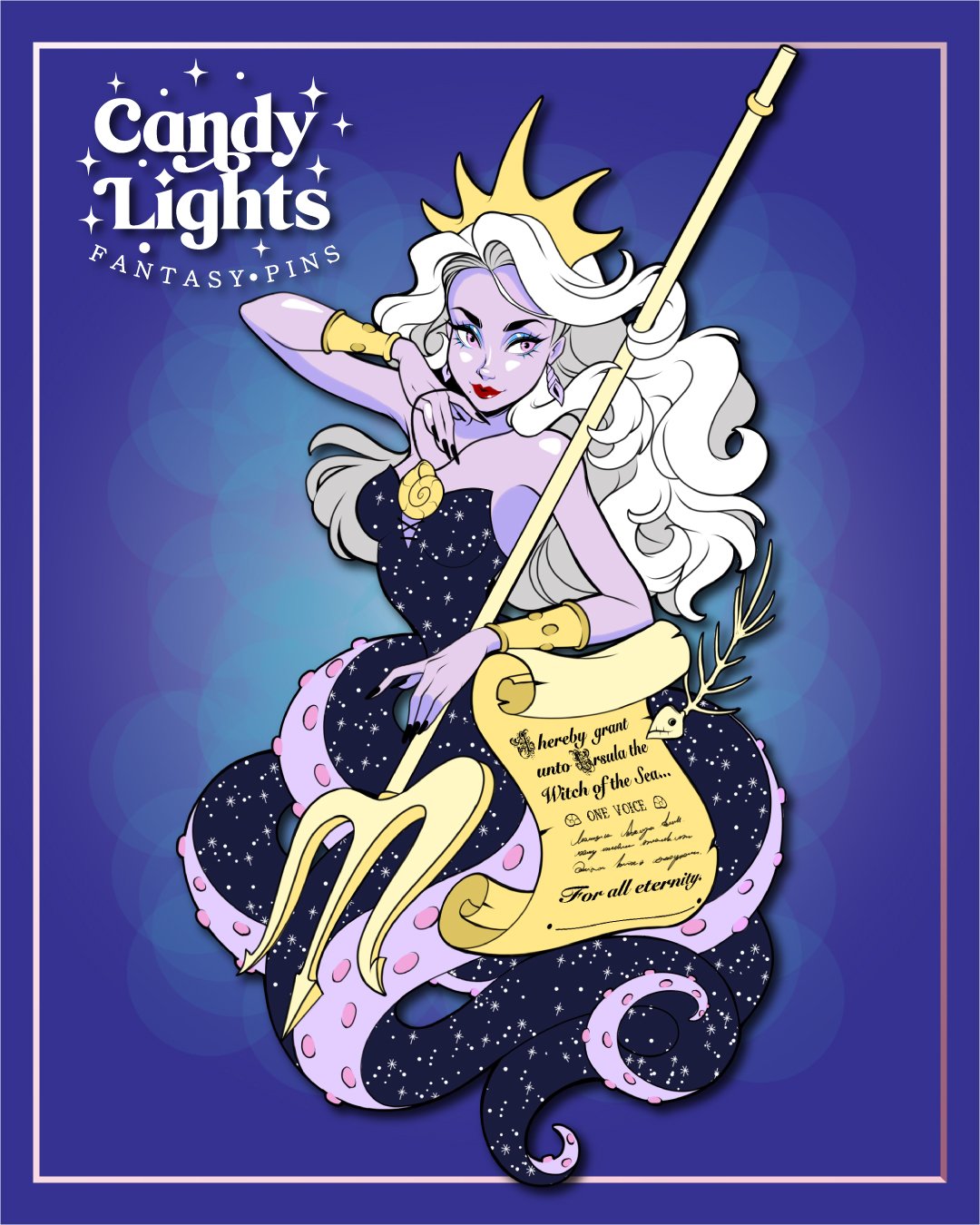 Dive deep into the lairs of the sea with the Variant companion to our Under the Sea Dreams Ariel. Our favorite Sea Sorcerers is now clad in her fabulous witchy form. This hard enamel pin stands at six inches (15cm) tall and will feature gold colored plating. Vanessa showcases our detailed screen printing effects along with glitter magic and pearlescent effects.